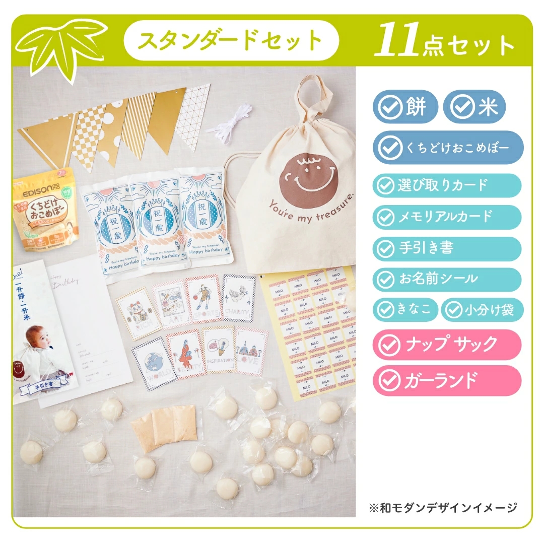 ・お餅シールの名入れは対応しておりません。ご自身でご記入頂きます様お願い致します。・メモリアルカードへの名入れは対応しておりません。名前・記念日・出生時の身長体重・1歳の身長体重はお客様ご自身でご記入ください。